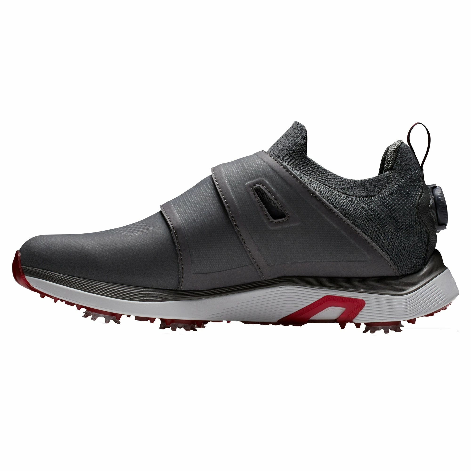 The FootJoy HyperFlex Boa Golf Shoes deliver ultimate waterproof breathability for any conditions. These shoes are built with a breathable mesh upper that is lined with a membrane barrier for awesome waterproof protection and the StratoFoam Cushioning System will absorb shock for maximum comfort that will minimize and reduce underfoot fatigue. The OptiFlex outsole features properly placed flex grooves so the shoe flexes in the right location during the golf swing and Pulsar soft spikes and molded traction provide grip in all conditions. There is also a super soft ribbed knit cuff that will surround the foot for no-slip fit that adds to the comfort.