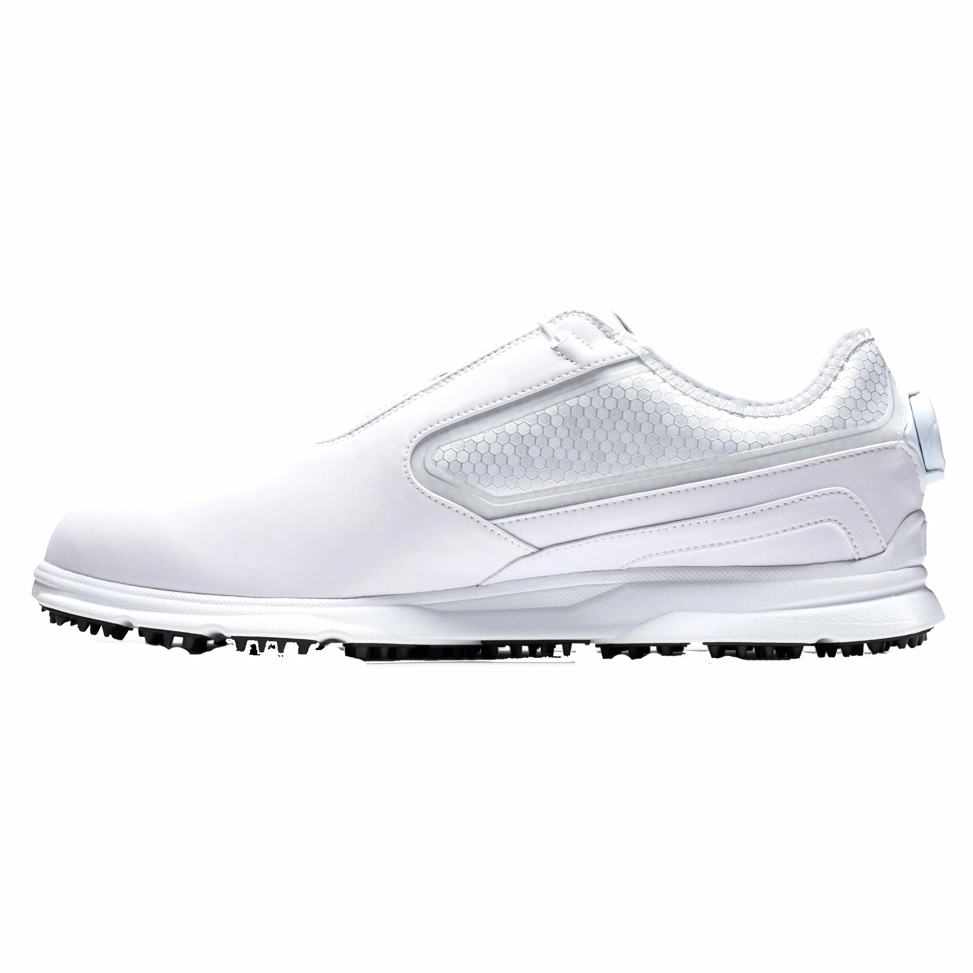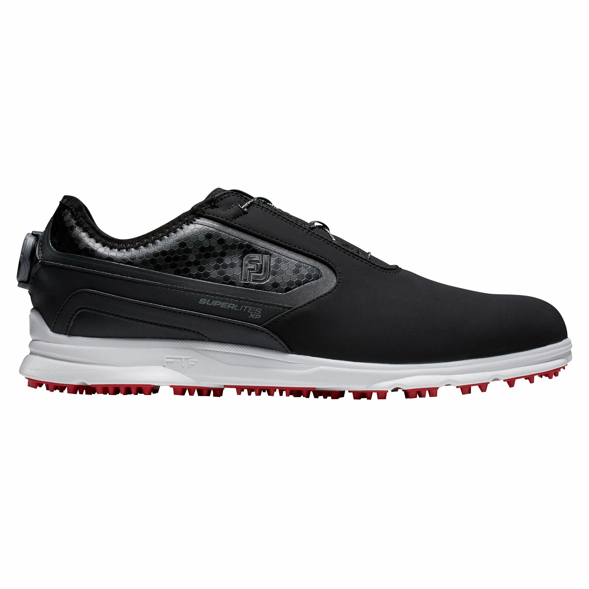 Perfect for summer rounds on the golf course comes the FootJoy Superlites XP BOA Golf Shoes. These shoes are light, flexible and provide 100 percent waterproof protection from morning dew to rain thanks to the performance synthetic leather upper that keep your feet dry and comfortable. The BOA fit system on the Superlites allow golfers to dial in that just right fit. The molded high-density EVA FitBed works with a FTF foam to enhance the comfort of this shoe to provide maximum walkability in every round. The Infinity outsole on the Superlites make this the most stable spikeless shoe FootJoy has made and offers golfers the perfect grip and ground contact. The full rounded toe character with its standard fit across the forefoot and instep provide added cushioning.