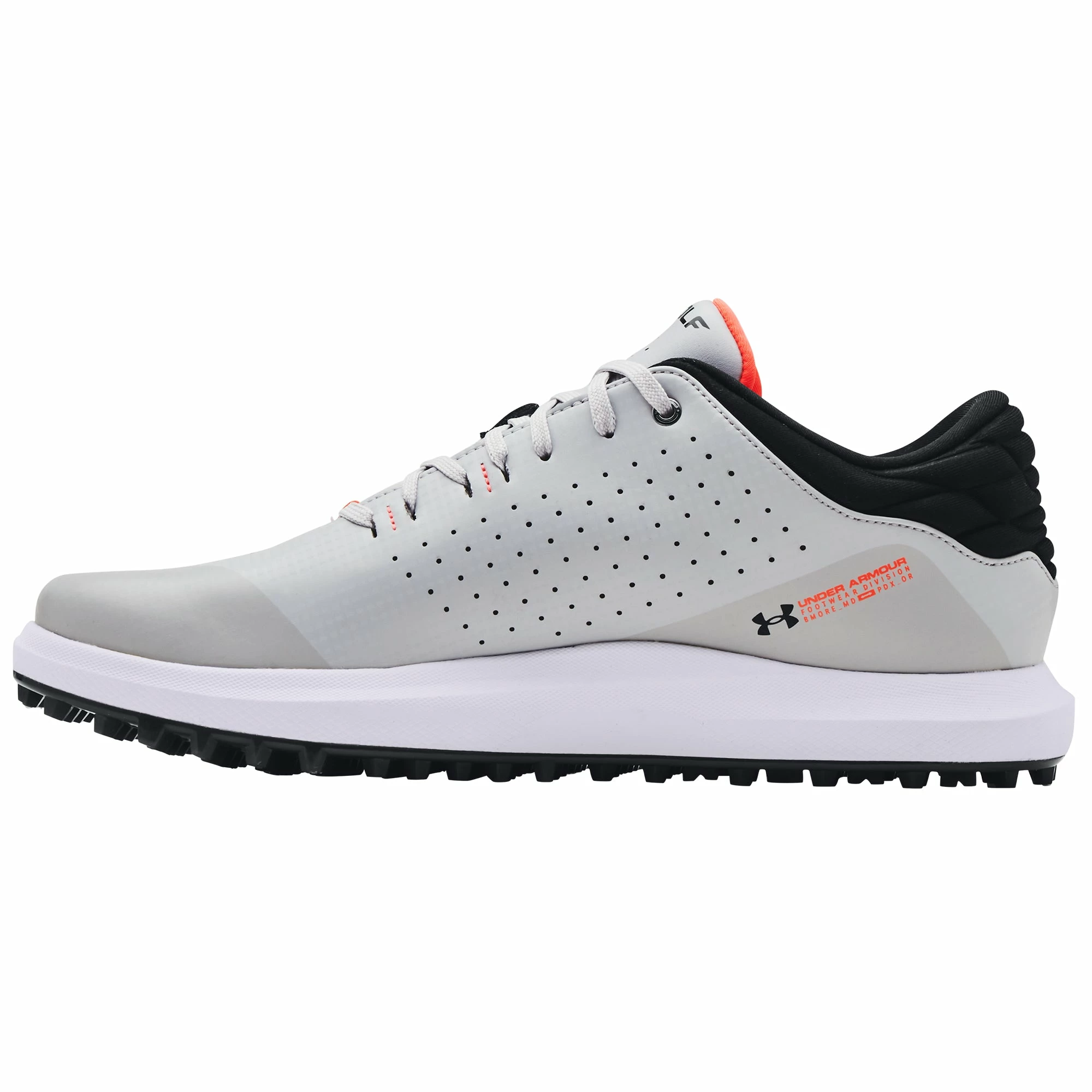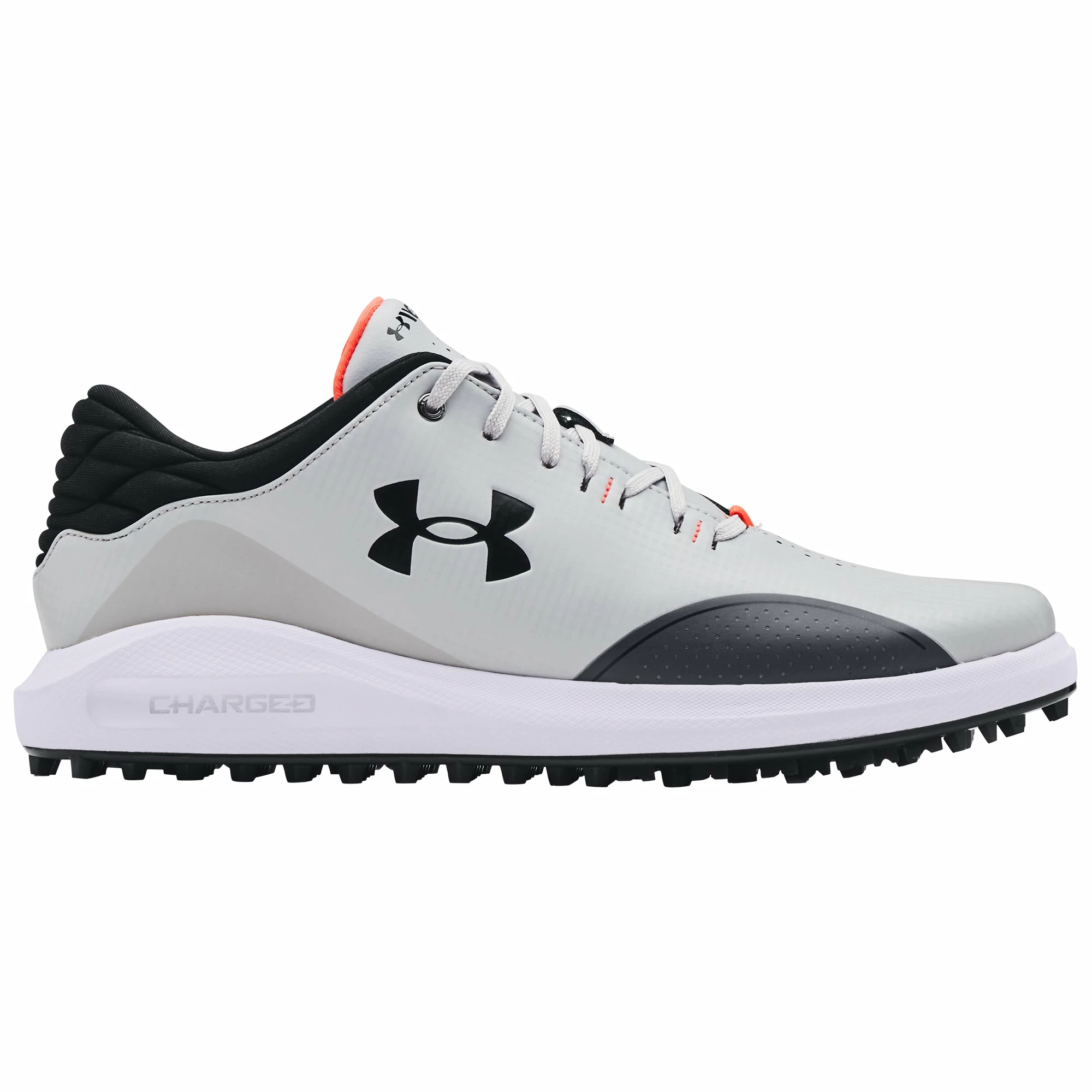 Stay comfortable and focused with the Under Armour Draw Sport Spikeless Golf Shoes. The Draw Sport shoes feature a breathable and durable microfiber leather upper that also has the Never Wet treatment that will keep your feet cool and dry throughout the entire round. There is a molded EVA footbed that provides step-in comfort and a Charged Cushioning midsole utilizes a compression molded foam for responsiveness and durability. The UA Rotational Resistance outsole provides lightweight lockdown traction on any surface and the spikeless outsole is lighter and more flexible while still maintaining traction.
